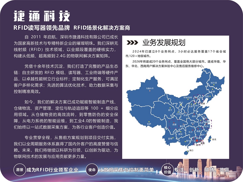 随着人工智能与物联网技术的深度融合,一场聚焦 “AI+IoT” 前沿进展的行业盛会即将拉开帷幕。AGIC + IOTE 2025 第 24 届国际物联网展 - 深圳站,将于 2025 年 8 月 27-29 日在深圳国际会展中心(宝安新馆)盛大举办。本次展会规模扩大至 8 万平方米,预计将有超过 1000 家行业先锋企业参与,集中展示在智慧城市、工业 4.0、智能家居等多个领域的创新成果。 作为国家高新技术、专精特新企业,深圳市捷通科技有限公司已确定参展,诚邀各界人士莅临交流! 关于捷通科技 深圳市捷通科技有限公司成立于 2011 年,专注于无线射频(RFID)技术的研发与应用,拥有 10 余年行业经验。公司提供从低频到超高频以及 2.4G 全频段的物联网解决方案,自主研发 RFID 模组、读写器、智能网关、工业终端等硬件,还能提供电子标签定制化生产及算法优化服务。凭借专业的技术和服务,已为智慧物流、资产管理、智能交通等 20